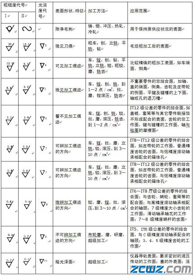表面粗糙度:指加工表面具有的较小间距和微小峰谷不平度。其两波峰或两波谷之间的距离(波距)很小(在1mm以下),用肉眼是难以区别的,因此它属于微观几何形状误差。表面粗糙度越小,则表面越光滑。表面粗糙度的大小,对机械零件的使用性能有很大的影响,主要表现在以下几个方面: ① 表面粗糙度影响零件的耐磨性。表面越粗糙,配合表面间的有效接触面积越小,压强越大,磨损就越快。 ② 表面粗糙度影响配合性质的稳定性。对间隙配合来说,表面越粗糙,就越易磨损,使工作过程中间隙逐渐增大;对过盈配合来说,由于装配时将微观凸峰挤平,减小了实际有效过盈,降低了联结强度。 ③ 表面粗糙度影响零件的疲劳强度。粗糙零件的表面存在较大的波谷,它们像尖角缺口和裂纹一样,对应力集中很敏感,从而影响零件的疲劳强度。 ④ 表面粗糙度影响零件的抗腐蚀性。粗糙的表面,易使腐蚀性气体或液体通过表面的微观凹谷渗入到金属内层,造成表面腐蚀。 ⑤ 表面粗糙度影响零件的密封性。粗糙的表面之间无法严密地贴合,气体或液体通过接触面间的缝隙渗漏。此外,表面粗糙度对零件的外观、测量精度也有影响。 表面粗糙度Ra值的应用范围 ![]() 注:1. 粗糙度代号I为第一种过渡方式。它是取新国标中相应最靠近的下一档的第1系列值,如原光洁度(旧国标)为▽5,Ra的最大允许值取6.3。因此,在不影响原表面粗糙要求的情况下,取该值有利于加工。 2. 粗糙度代号Ⅱ为第2种过渡方式。它是取新国标中相应最靠近的上一档的第1系列值,如原光洁度为▽5,Ra的最大允许值取3.2。因此,取该值提高了原表面粗糙度的要求和加工的成本。 |
